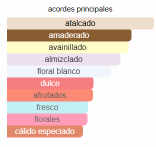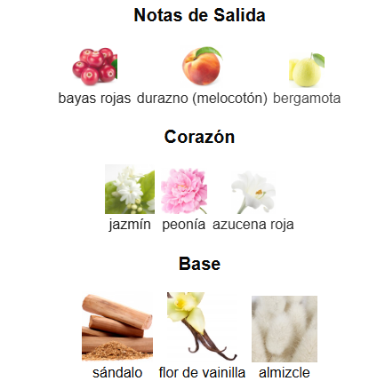 Acordes principales: Atalcado, amaderado, avainillado, almizclado, floral blanco, dulce, afrutado, fresco, floral y cálido especiado